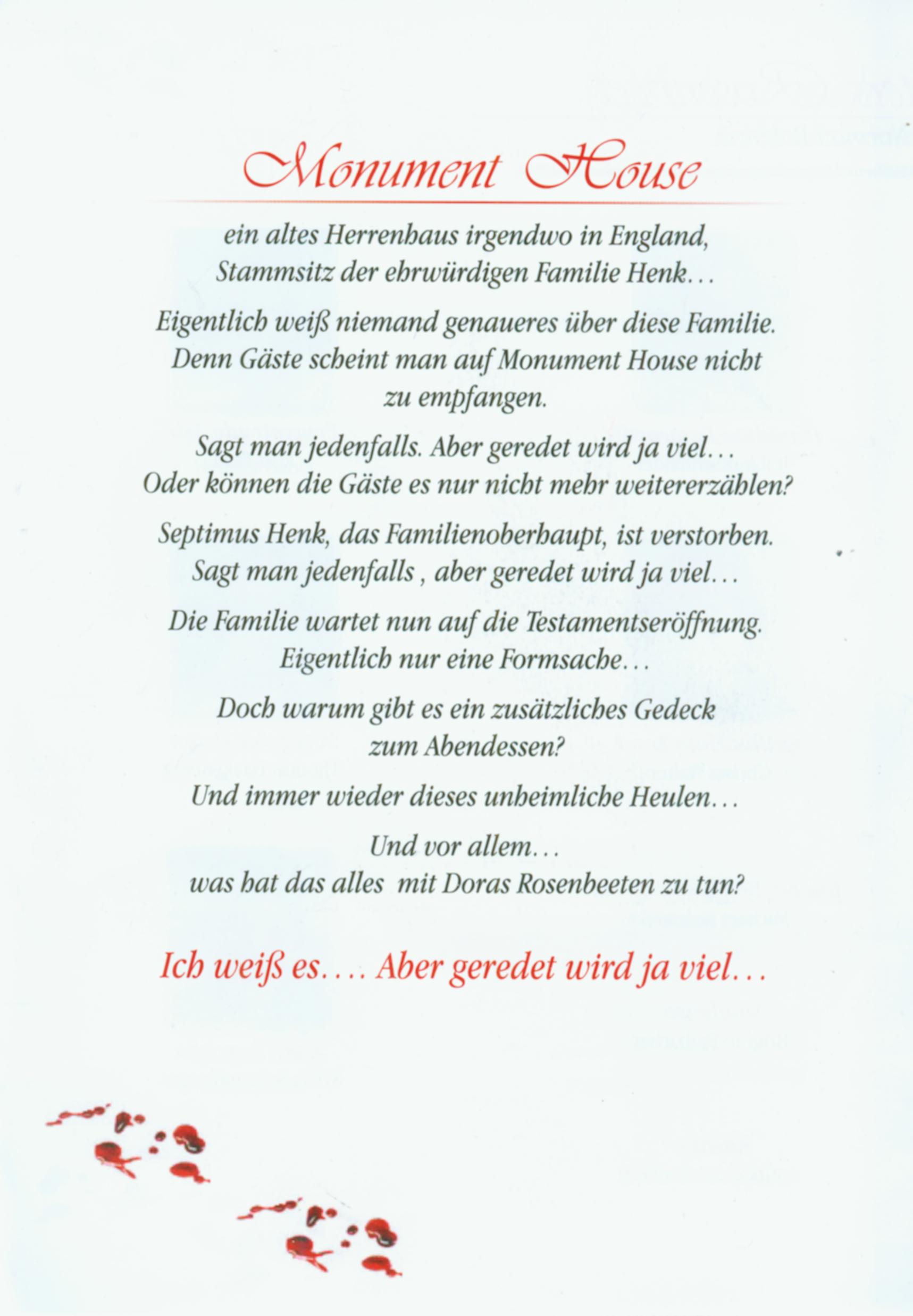 Im nahen Dorf hält man sie für die Familie Frankenstein. Und warum? Nur weil hin und wieder Leute, die Monument House aufsuchten, Versicherungsvertreter oder Installateure z.B., danach nie wieder gesehen wurden? Sicher nur Dorftratsch. Aber jetzt ist der alte Septimus Henk verstorben und seine Kinder warten seit 6 Wochen auf die Verlesung des Testaments: